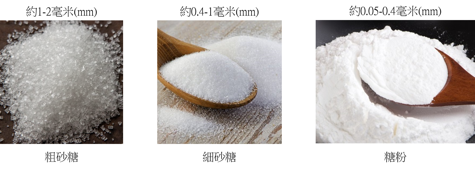 以平時用的食用糖來為例,粗糖的粒徑大概在1-2毫米,而細砂糖的粒徑就在400-1000微米。還有一些特殊用途的食用糖,如細砂糖,粒徑大約在50-400微米。
